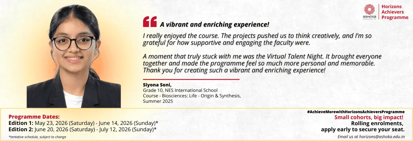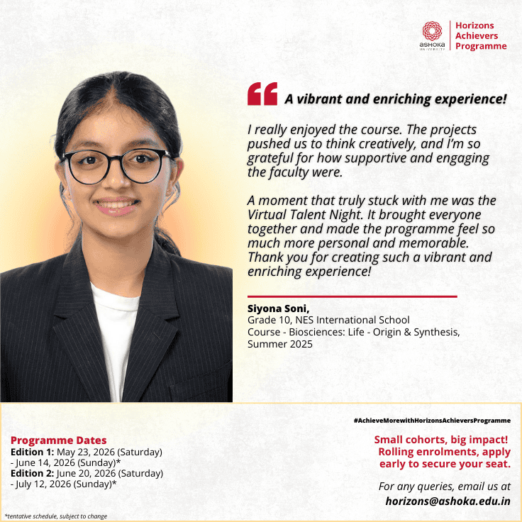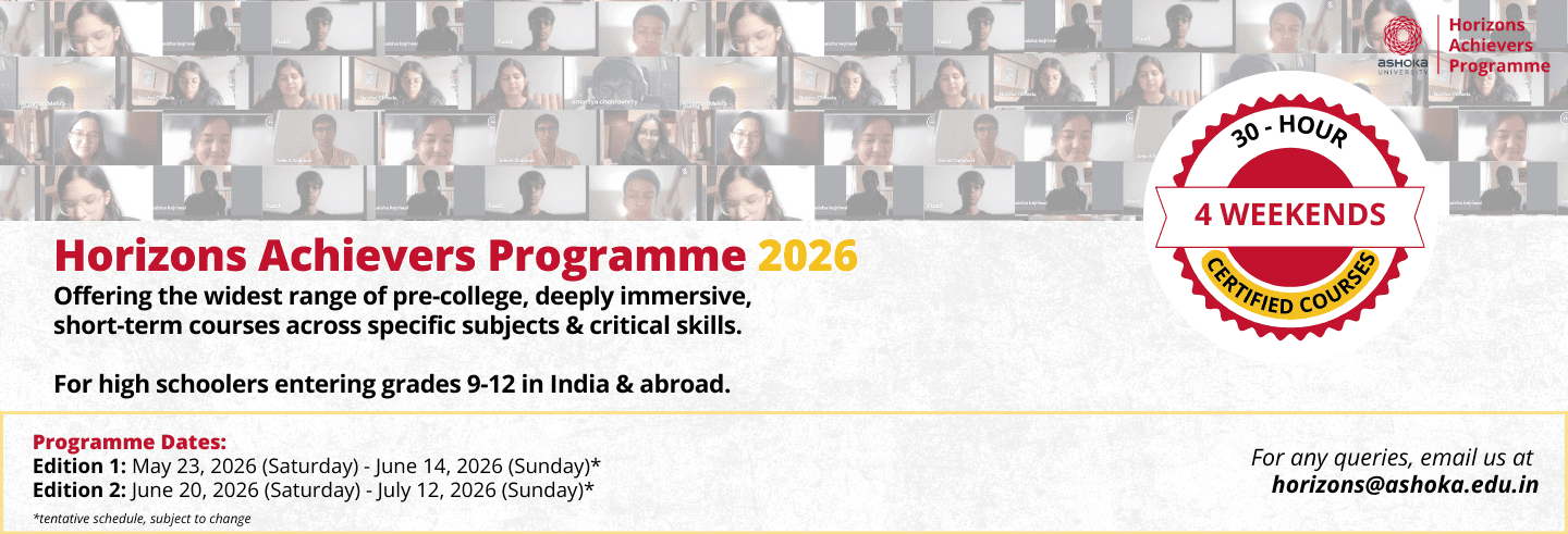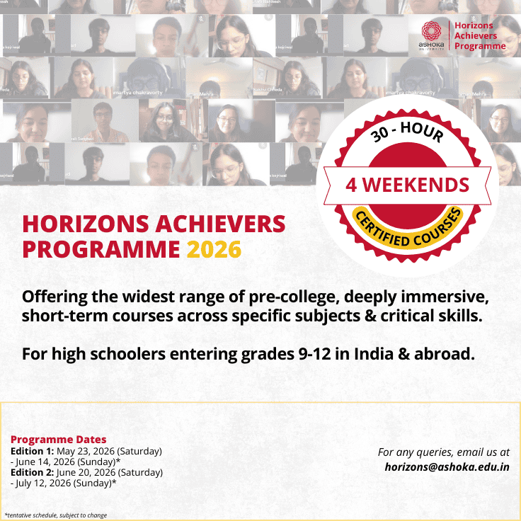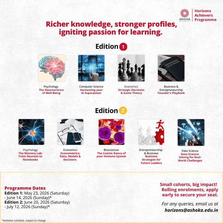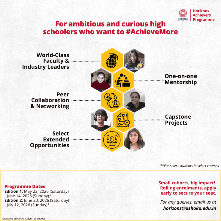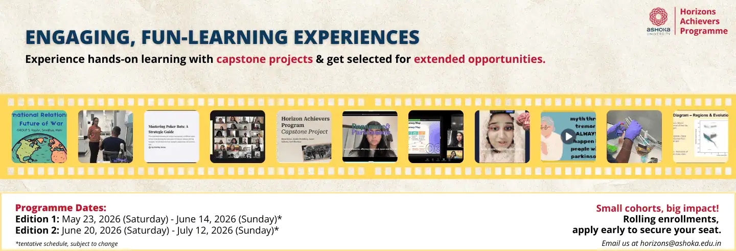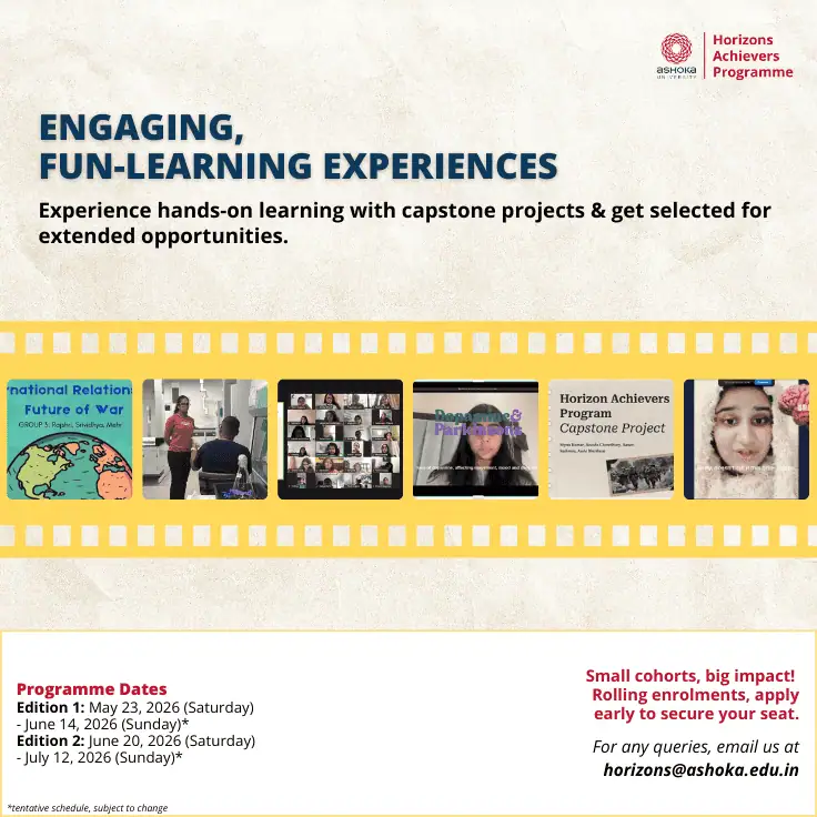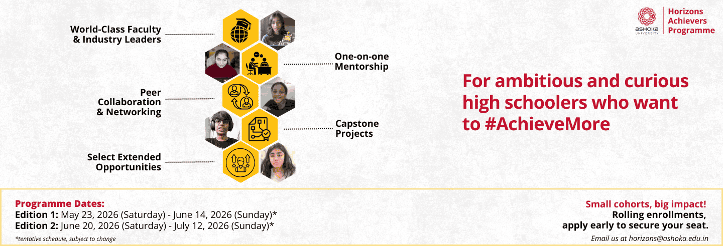 Ashoka Horizons Achievers Programme offers students an unparalleled opportunity to dive deep into specific subjects of interest or skills of relevance. Students engage in dialogic sessions, collaborate with peers on real-world scenarios and complete capstone projects with one-on-one mentorship with experts. The upcoming programme, scheduled for winter 2025 & summer 2026, provides an immersive learning experience in different disciplines such as Writing & Communication, Economics, Entrepreneurship & Business, Psychology, Data Science and many more. The programme is crafted to enhance knowledge and hone the skills of high schoolers to prepare for early for college.